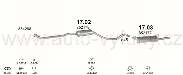 Tlumič výfuku střední , kód: 17.02 Příklad použití: Opel Ascona 81-89 1.3/1.6/1.8E, kódy Bosal Walker aj.: 05.007 34.6062 292-835 P4377 54.50.06... |