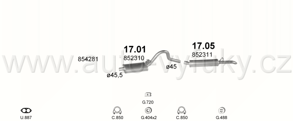 Tlumič výfuku koncový , kód: 17.05 Příklad použití: Opel Ascona B 75-81/Manta 75-87, kódy Bosal Walker aj.: 05.005 34.7051 185-939 P4374 54.42.07... |