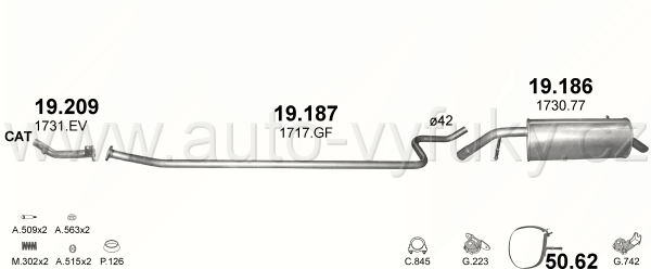 Trubka střední , kód: 19.187 Příklad použití: Peugeot 207 1.4i 06/04/08, kódy Bosal Walker aj.: 36.5032 950-015 19.5.01 505512 P4606 27.108 PG797B... |