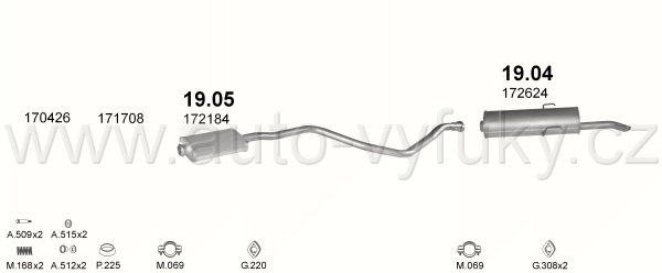 Tlumič výfuku střední , kód: 19.05 Příklad použití: Peugeot 405 1.4 87-96, kódy Bosal Walker aj.: 08.009 36.6030 283-785 19.3.92 P4707 57.60.06... |