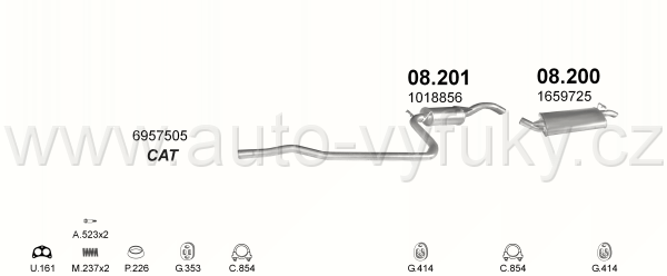 Tlumič výfuku střední , kód: 08.201 Příklad použití: Ford Fiesta 89-93 1.6i/XR2, kódy Bosal Walker aj.: 14.6067 285-045 37.40.06 260133 01.51600... |