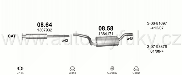 Tlumič výfuku přední , kód: 08.64 Příklad použití: Ford Focus/ C-Max 1.4i/1.6i ; Volvo C30/S40, kódy Bosal Walker aj.: 14.6103 154-711 04.204.80... |
