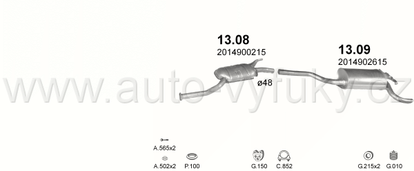 Tlumič výfuku střední , kód: 13.08 Příklad použití: Mercedes W201 82-93 1.8/2.0, kódy Bosal Walker aj.: 01.011 28.6003 175-123 23.179.845 353007...