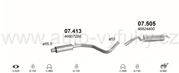 Tlumič výfuku opravný , kód: 07.413 Příklad použití: Fiat Stilo 1.9 JTD 01-, kódy Bosal Walker aj.: 16.034 12.6101 12.7122 279-401 279-405 03.202.80... |