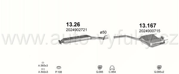 Tlumič výfuku střední , kód: 13.26 Příklad použití: Mercedes C220 93-96 2.2D, kódy Bosal Walker aj.: 71132 2024902721 e3 03 0982 |