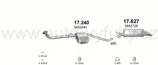 Tlumič výfuku střední , kód: 17.240 Příklad použití: Opel Omega B 2.0DTi/2.5TD SDN kat 94-, kódy Bosal Walker aj.: 05.134 283-755 07.396.80 07.395.80... |