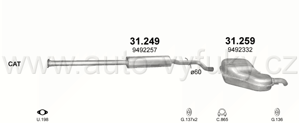Tlumič výfuku koncový , kód: 31.259 Příklad použití: Volvo S80 2.4i 98-00, kódy Bosal Walker aj.: 60.7034 235-139 01.60733 22798 9492332 e3 03 10972 |