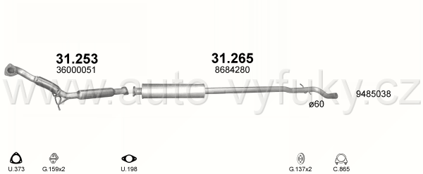 Tlumič výfuku náhrada , kód: 31.253 Příklad použití: Volvo V70 2.4 TDi 20V Turbo Diesel 01/00-12/01, kódy Bosal Walker aj.: VL90212K 8603034 |