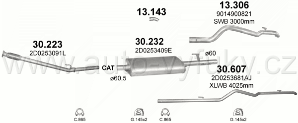 Tlumič výfuku střední , kód: 30.232 Příklad použití: VW LT 96- 2.5SDi/2.5TDi/2.8TDi Mercedes Sprinter 2.9 TD, kódy Bosal Walker aj.: 02.050 04.090...